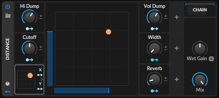 Click on the bottom-left square to expand the XY pad. The X-axis controls the stereo panning. The Y-axis controls distance away from the listener.